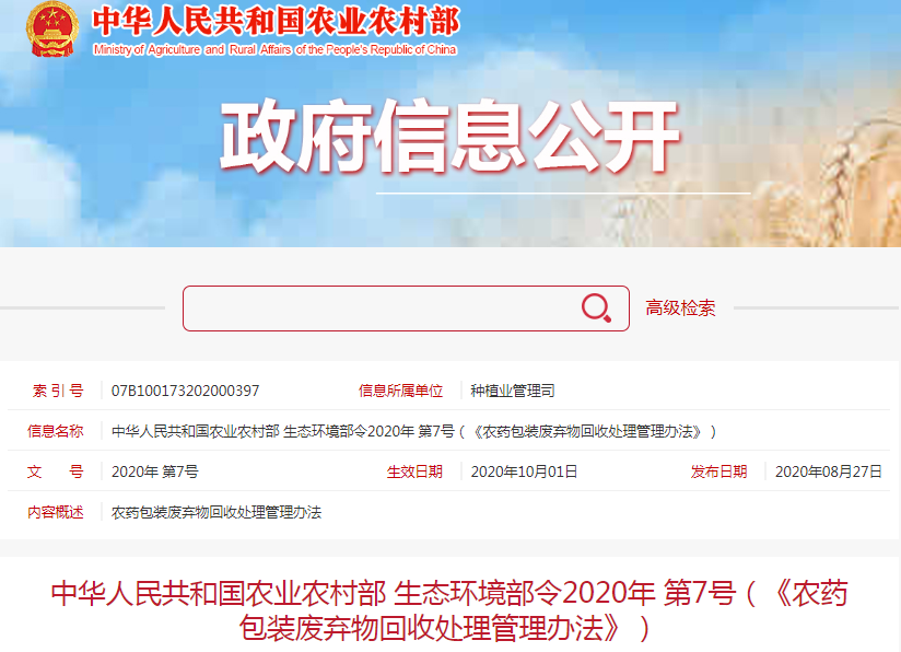 第八條縣級以上地方人民政府農業(yè)農村和生態(tài)環(huán)境主管部門應當采取多種形式,開展農藥包裝廢棄物回收處理的宣傳和教育,指導農藥生產者、經營者和專業(yè)化服務機構開展農藥包裝廢棄物的回收處理。