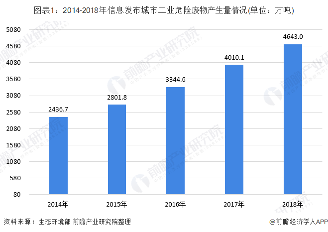 根據(jù)生態(tài)環(huán)境部發(fā)布的《全國大、中城市固體廢物污染環(huán)境防治年報(bào)》數(shù)據(jù)顯示,2014-2018年信息發(fā)布城市工業(yè)危險(xiǎn)廢物產(chǎn)生量逐年上升。2018年,200個大、中城市工業(yè)危險(xiǎn)廢物產(chǎn)生量達(dá)4643.0萬噸。